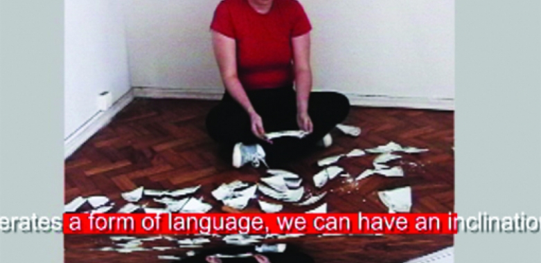 Sitting on the floor against a white wall, a woman shatters with a hammer seven dishes laid before her. She shows no emotion whatsoever.