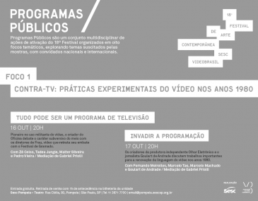 The first meeting, featuring José Celso Martinez Corrêa, Tadeu Jungle, Walter Silveira, and Pedro Vieira, will focus on experiments such as Teatro Oficina and production company TVDO, as well as the legacies of Glauber Rocha, Oswald de Andrade, and Chacrinha, among other topics. The meeting will review video’s contribution to the materialization of ideas and questionings. In the second meeting, Fernando Meirelles, Marcelo Tas, Marcelo Machado, and Goulart de Andrade will expand on these topics, focusing on the space created by Videobrasil, the country’s first regularly-held video festival.